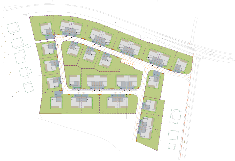Na ograjeni parceli, ki lahko meri od 405m2 do 927 m2 je hiša umeščena tako, da je na voljo dovolj možnosti ureditve prijetnega kotička za druženje v poletnih mesecih ali izvajanje ostalih aktivnosti na prostem. Zagotovljeno je tudi zadostna površina za parkiranje, ki je pred samim nadstreškom za dva avtomobila in je vključen v arhitekturo same hiše.