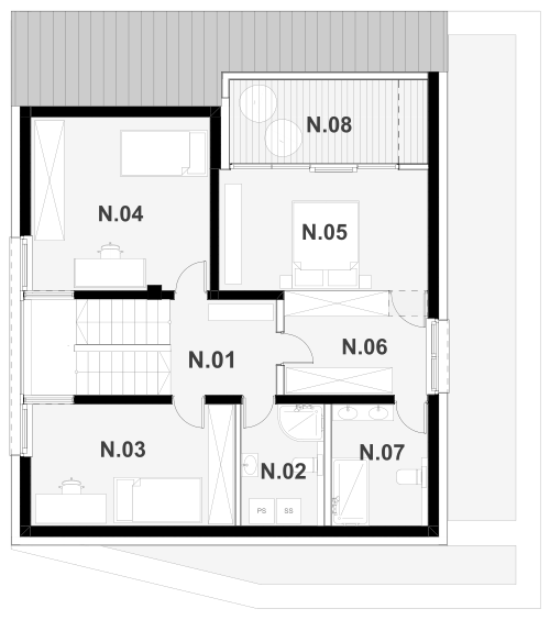 Pritličje in nadstropje povezuje stopnišče, ki je zasnovano tako, da prejme čim več svetlobe in je tudi delno odprto v dnevno bivalni del prostorov.