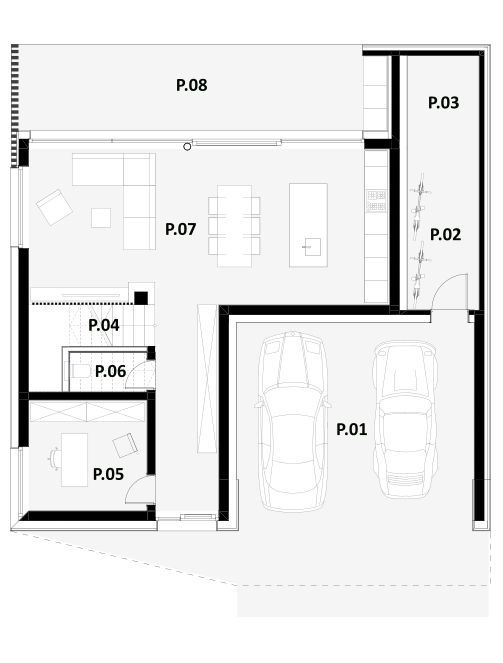 Pritličje še vključuje uporabne prostore kabineta (po potrebi se lahko preuredi v dodatno spalno sobo), WC ter nadstrešek za avtomobile, ki se zaključuje z uporabno shrambo in tehničnem prostorom.